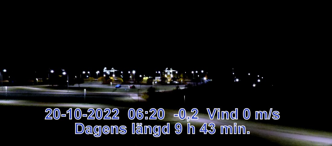 0° C Vind 0 m/s Klart och uppehållsväder Lufttryck 1022 hPa Sikt 50000 m Soluppgång 07:42 Solnedgång 17:26 Dagens längd 9 h 43 min.