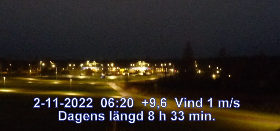 +9° C Vind 1 m/s Mulet, men troligen uppehåll Lufttryck 1010 hPa Sikt 12715 m Soluppgång 07:16 Solnedgång 15:49 Dagens längd 8 h 33 min.