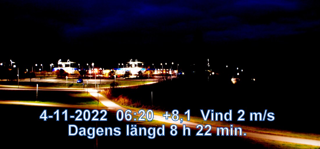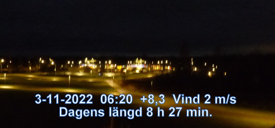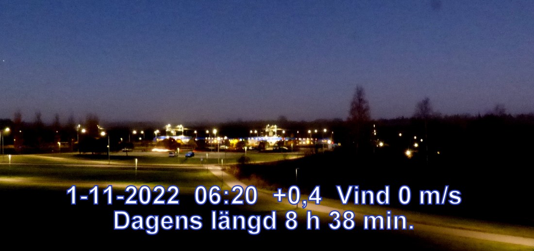 +9° C Vind 2 m/s Mulet, men troligen uppehåll Lufttryck 1012 hPa Sikt 23187 m Soluppgång 07:21 Solnedgång 15:44 Dagens längd 8 h 22 min.