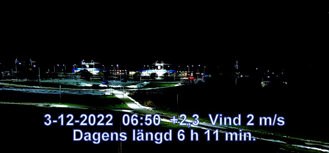+1° C Vind 2 m/s Mulet, men troligen uppehåll Lufttryck 1037 hPa Sikt 15997 m Soluppgång 08:33 Solnedgång 14:45 Dagens längd 6 h 11 min.