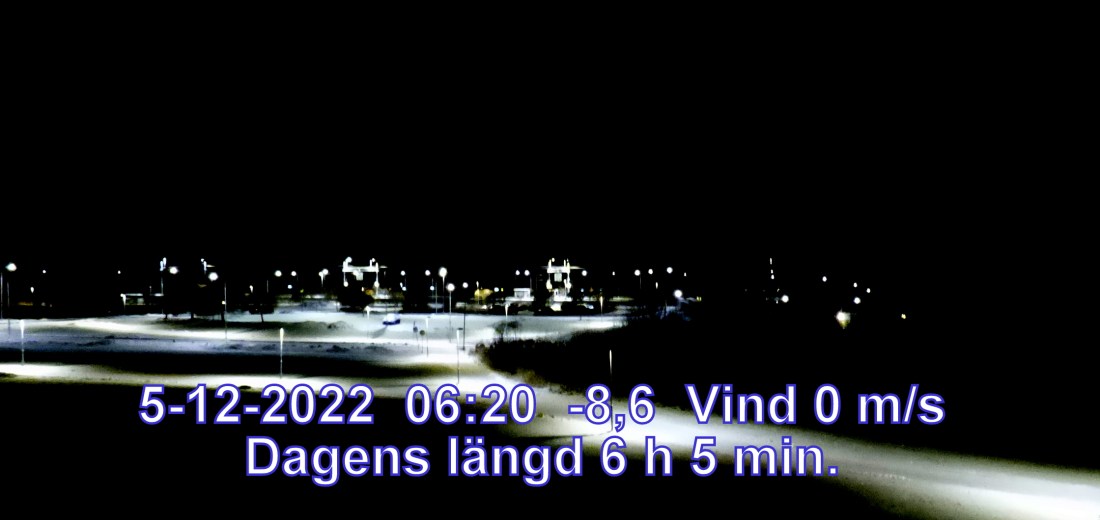 -9° C Vind 0 m/s Mest klart och uppehåll Lufttryck 1032 hPa Sikt 50000 m Soluppgång 08:37 Solnedgång 14:43 Dagens längd 6 h 5 min.