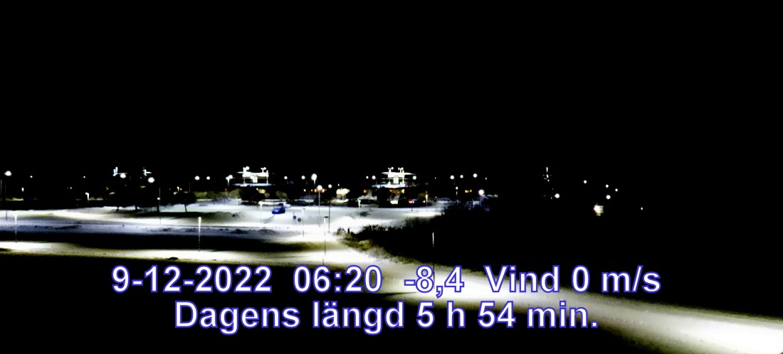 -8° C Vind 0 m/s Mulet, men troligen uppehåll Lufttryck 1006 hPa Sikt 48411 m Soluppgång 08:44 Solnedgång 14:39 Dagens längd 5 h 54 min.