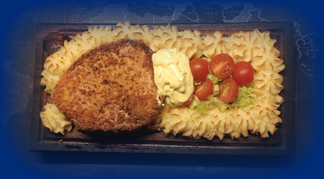 Ja det stämmer,hade en färdigkokt skinka som jag skar 2 skivor av kanske 6-7 mm tjocka,bredde på lite Johnnys senap på den ena lade på ett par ostskivor,lade på den andra skivan,panerade,ägg och panko,stekte på köttet till fin färg.På plankan blev det potatismos lite grönt och bea…I glaset ett rött från Spanien..Smakade alldeles utmärkt..