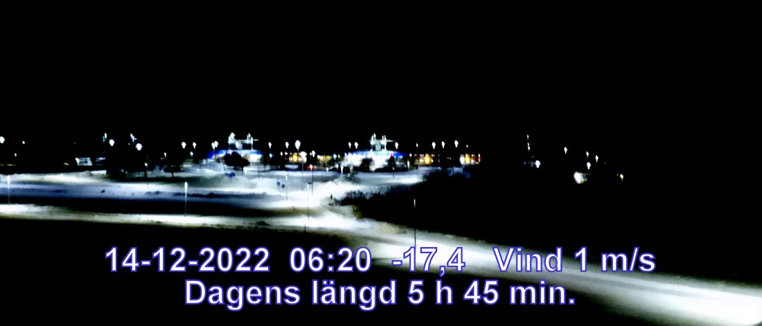 -17° C Vind 1 m/s Mulet, men troligen uppehåll Lufttryck 1000 hPa Sikt 50000 m Soluppgång 08:51 Solnedgång 14:37 Dagens längd 5 h 45 min.