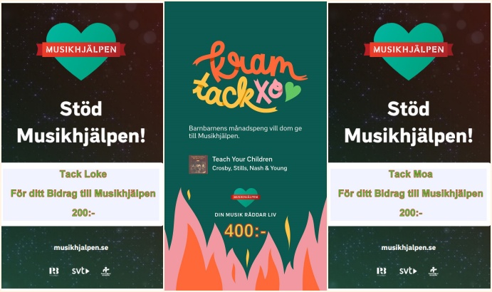 Nu har barnbarnens lilla månadspeng,med barnens godkännande gått till Musikhjälpen,så som den gjort de senaste åren.Tack Loke & Moa…Klicka på bilden och lyssna på den önskade låten.
