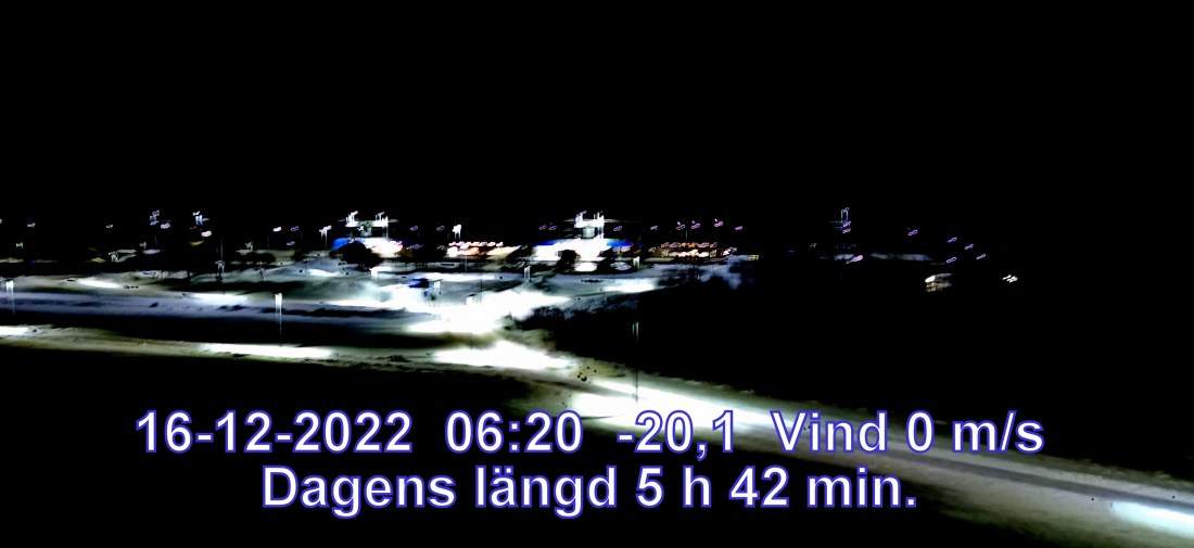 -20° C Vind 0 m/s Klart och uppehållsväder Lufttryck 1010 hPa Sikt 50000 m Soluppgång 08:54 Solnedgång 14:37 Dagens längd 5 h 42 min.