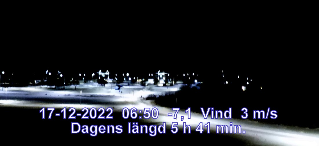 -6° C Vind 3 m/s Mulet, men troligen uppehåll Lufttryck 1018 hPa Sikt 11910 m Soluppgång 08:55 Solnedgång 14:37 Dagens längd 5 h 41 min.