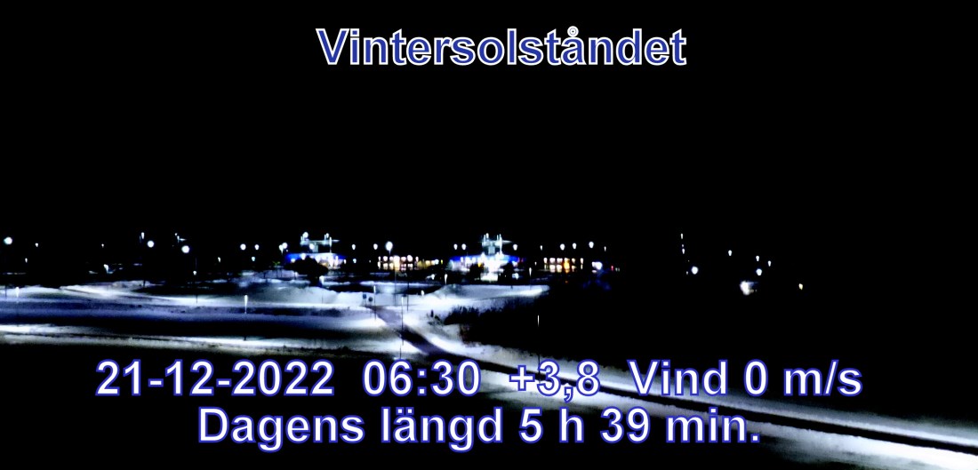 +2° C Vind 0 m/s Mulet, men troligen uppehåll Lufttryck 996 hPa Soluppgång 08:58 Solnedgång 14:38 Dagens längd 5 h 39 min.