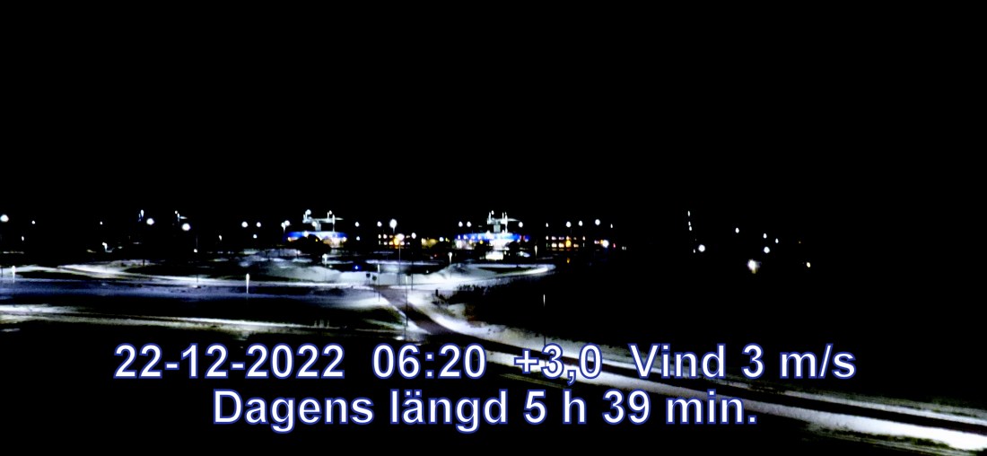 +3° C Vind 3 m/sMulet, men troligen uppehåll Lufttryck 994 hPa Sikt 36882 m Soluppgång 08:58 Solnedgång 14:38 Dagens längd 5 h 39 min.