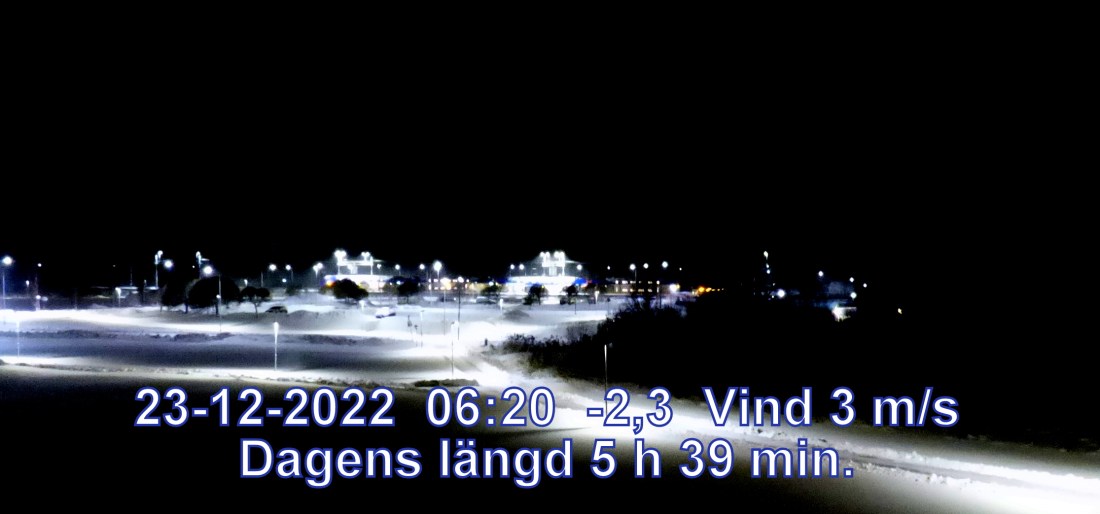 -3° C Vind 3 m/s Mulet, men troligen uppehåll Lufttryck 996 hPa Sikt 1869 m Soluppgång 08:59 Solnedgång 14:39 Dagens längd 5 h 39 min.