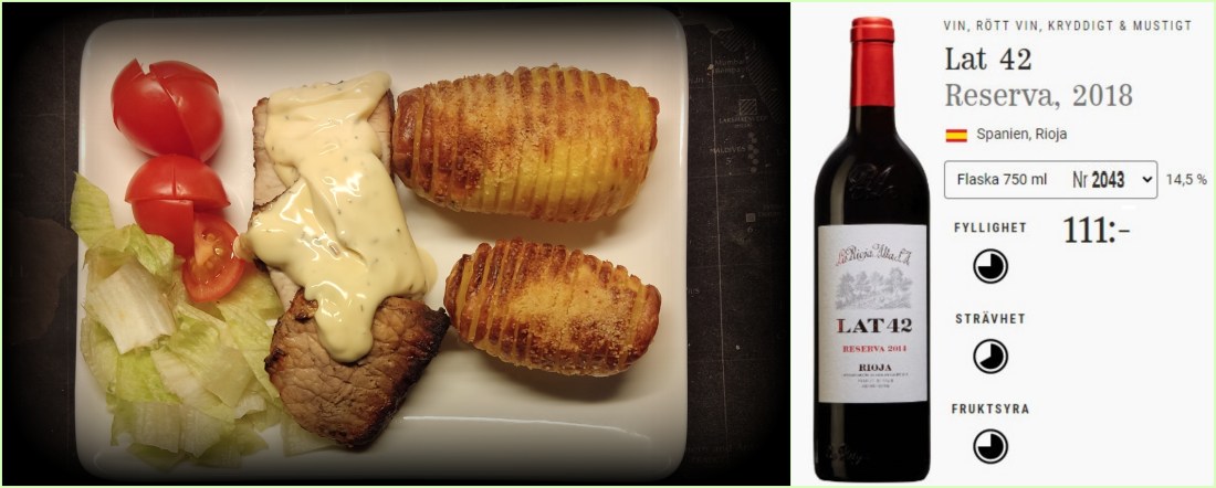 Ja det blev det på riktigt.Helstekt Fläskytterfilé i ugnen som jag gjorde den 10 Januari,idag blev det dom 3 sista bitarna med Bea och Hasselbackpotatis,lite grönt fick plats på tallriken..Eftersom det är lilllördag så blev det rött i glaset.En Spanjor frå 2018..Funkade mycket bra tillsammans med det so, låg på fatet.