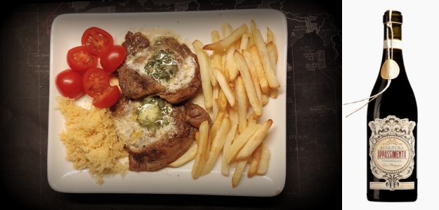 Ja det kan jag tycka,bankade ut ett par bitar fläskfilé som jag kryddade på med salt och svartpeppar,stekte på dom,körde lite pommes i airfryern,toppade filéerna med lite mozzarellaost och persiljesmör,på tallriken blev det även lite tomat och riven kålrot,blev tametusan riktigt gott..I glaset hade jag en röd från Italien en Appassimento,inte så tokig..