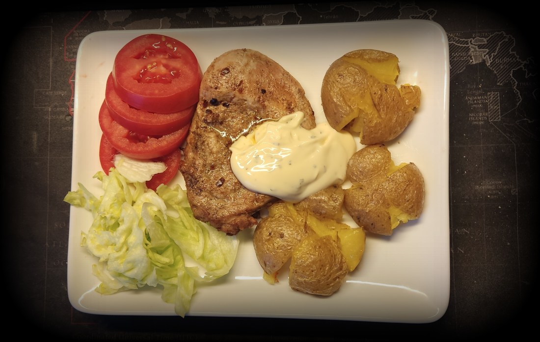 Det blev inget avanserat idag på tallriken,en bit Fläskfilé kraschad potatis bea och lite grönt,smakade riktigt bra..