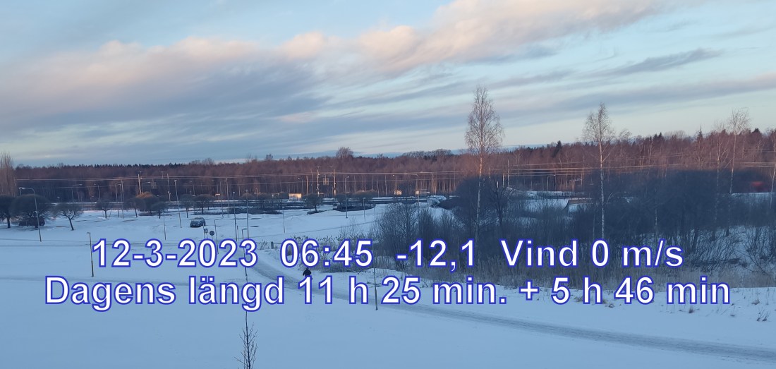 -12° C Vind 0 m/s Mulet, men troligen uppehåll Lufttryck 995 hPa Sikt 50000 m Soluppgång 06:18 Solnedgång 17:43 Dagens längd 11 h 25 min.