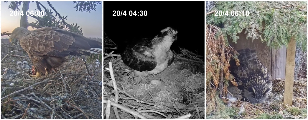 Kikade in i morse till bona,hos Havsörnen inget nytt 1 ägg fortfarande okläckt..Fiskgjusen var morgonpigg,men bara 1 ägg än så länge..Berguven rullade runt sina 3 ägg.Forts,,,Följer.