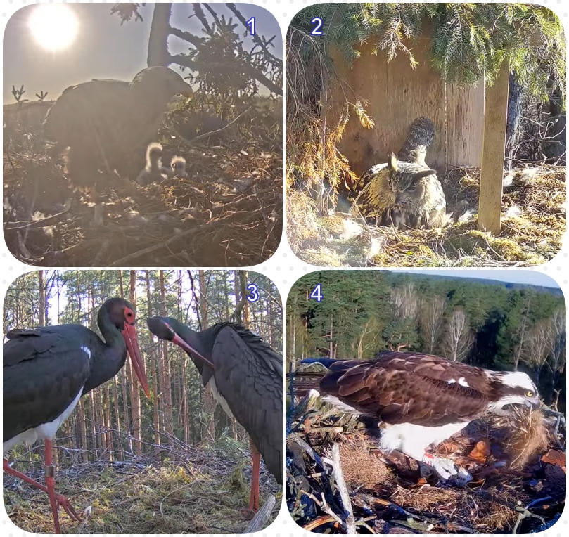 Jag kollade hur läget var i morse..1 Havsörnen i Lettland motljuset gör att ungarna syns tydligt,fortfarande ett ägg okläckt,kanske det är obefruktat.. 2 Berguven i Estland ligger tryggt på sina tre ägg,rullar runt äggen med jämna mellanrum.Har bara sett partnern ett fåtal gånger,då när mörkret sänker sig.. 3 Svarta Storken i Estland,där är det morgontoalett fjäderputs på gång.Till vänster Karl och till höger Kaia..4 Fiskgjusen i Polen där pysslar honan med städning eller reparation av boet,två ägg som väntar på kläckning.