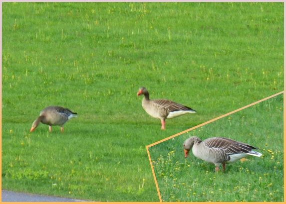 Här hemma återkom Grågåsen antar att det är samma som tidigare,,men idag var den inte ensam utan nu hade han/hon en kompis med sig.