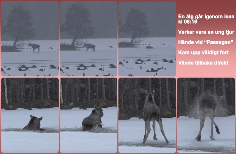 Ett ofrivilligt bad blev det för en ung älgtjur i morse..Den var väldigt försiktig när den gick på isen vid ”Passagen” den tvekade och såg ut att vilja vända tillbaka,men den fortsatte framåt och då,plötsligt brast isen under honom..Men det tog inte många sekunder innan han var uppe ur vaken,ruskade av sig vattnet och vände tillbaka in i skogen..Skönt att det gick bra för honom..
