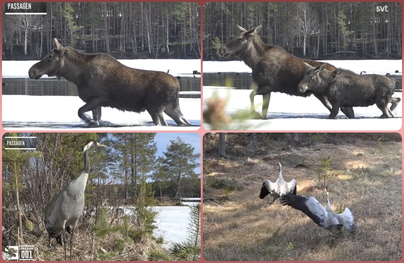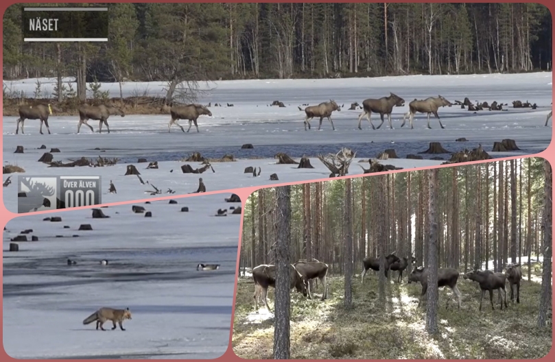 Här kommer ett svep från naturen onsdag 3 Maj..1) Fiskgjusemamman i Polen väntar på avlösning…2) Mamma Milda vilar i den uppgående solen de två ungarna sover…3) Hos Berguven i Estland kan man skymta 3 stycken små Uvnäbbar…4) I boet hos Svartstorken har Kaia lagt ett 3:e ägg under natten…Älgarna uppe i Junsele är fortfarande osäkra,om det går att simma över älven,försiktigt vandrar här 3 stycken över isen.Älgen i mitten med det gula halsbandet,,4974, älgko, fick halsband 21 mars 2022, uppskattad ålder vid tidpunkten: 6 år,,är döpt till Alice.