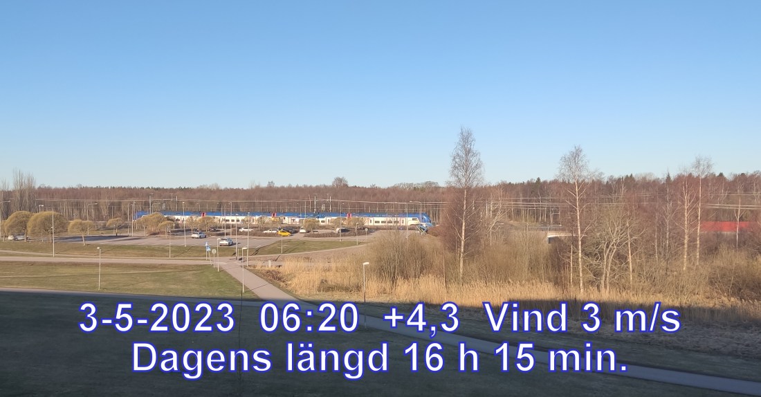 +3° C Vind 3 m/s Klart och uppehållsväder Lufttryck 1019 hPa Daggpunkt-2° Fuktighet 69 % Sikt 50000 m Soluppgång 04:40 Solnedgång 20:55 Dagens längd 16 h 15 min.