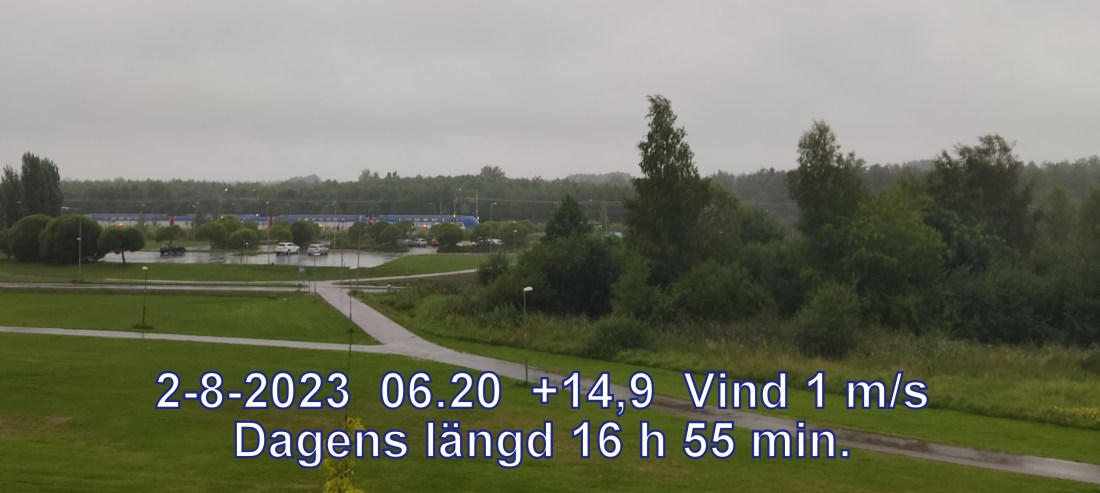 +15° C Vind 1 m/s Mulet, men troligen uppehåll Lufttryck 993 hPa Sikt 11118 m Soluppgång 04:28 Solnedgång 21:23 Dagens längd 16 h 55 min.