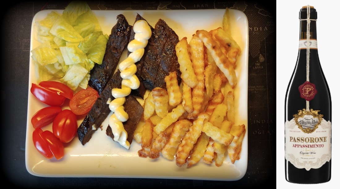 Det suger lite i magen efter 53 mil i bilen..Så jag ställde mig vis spisen och det skulle bli Valbiff med pommes lite grönt majonäs.Kryddade biffen rejält med salt,svartpeppar och vitlökspulver..Blev riktigt smarrigt,i glaset en Apassimento,kanske inte det bästa vinvalet men inte så dumt ändå..