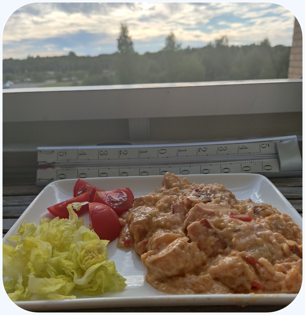 Det var skönt på balkongen idag så det blev utemat..En hittapå gryta med falukorv,potatis,paprika,rivost och creme fraice,lite grönt fick plats på tallriken.I högtalaren hade jag låtar som min bror spelat in för några år sedan hemma i sin studio..Låten är (Seven Lonley Days)..Sju Ensamma Kvällar.