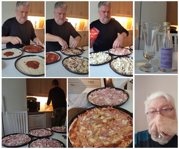 Ja vad händer då,egentligen inte något som kräver stora rubriker,men ändå för oss inblandade,något som är gott och blir gott framöver..Sonen tog på sig rollen som Pizzabagare,jag ställde upp som åskådare,och efter en stund,så testade jag en snaps,,en Taffel på Kummin och Dill inte så dum tyckte min gom..