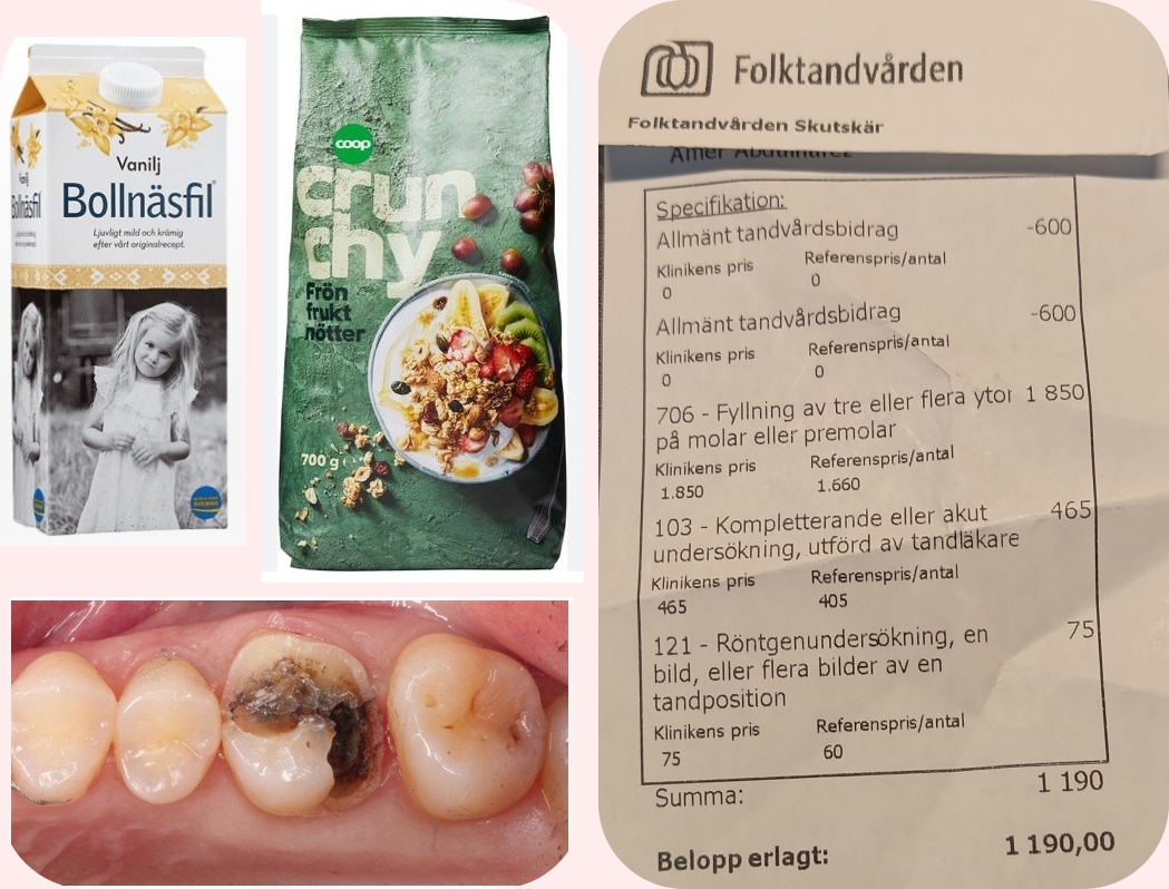 Det kan bli dyrt att inta Frukostfil med Crunchy myssli…………………………… Dagens frukost bestod av en tallrik med Bollnäsfil med lite Myssli/frön/frukt/nötter,en ganska vanlig frukost för mig..Men denna morgon,gick det åt H-vete med en av mina tänder,där satt en liten nötjävel i tanden..När jag pillat bort den så var det vassa kanter på tanden och det var stört omöjligt att hålla tungan borta från den trasiga tanden..Kontaktade Folktandvården,somlovade ringa tillbaka om en stund 10:30 ringde dom och efter lite prat om vad som hänt,fick jag frågan om jag kunde komma 12:30..Klart jag kunde..Så nu har jag en lagad tand,plånboken är kanske inte lika glad som jag..Men min frukost i morgon blir densamma,,man får inte ge sig..