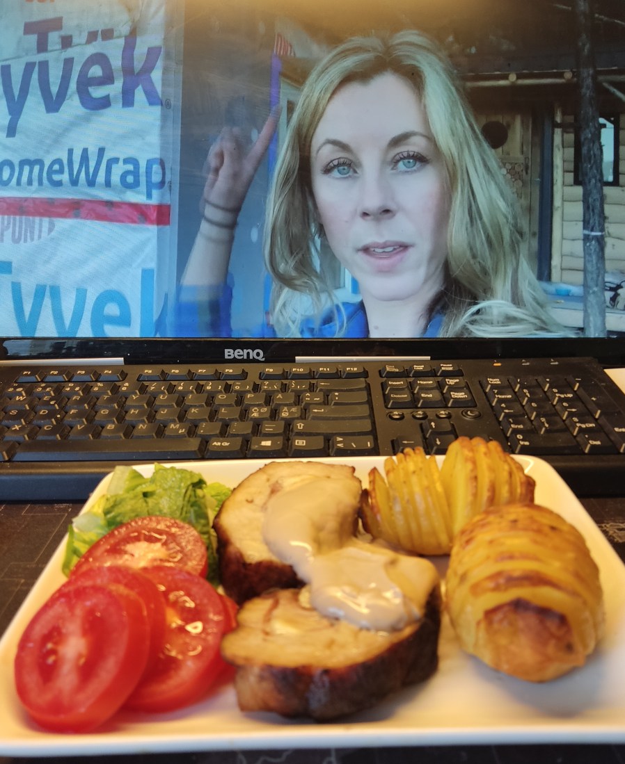 Oki,inte exakt lika som tidigare,men lika gott.Det blev inte uteäta idag,lite blåsigt och bara 15 grader.Det blev äta framför datorn,där jag kollade på Tuben.En tjej från Canada som bygger en liten stuga på en klipphäll med fin utsikt..Nu till tallriken Fläskytterfilé hasselbackpotatis och lite grönt,i glaset hade jag sista slatten av vinet från helgen som var.Smakade bra..