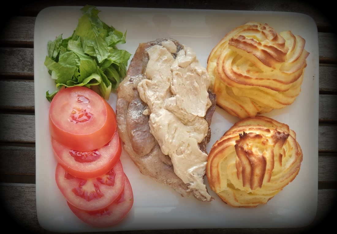 Det var lite grått men varmt +20 grader på balkongen kl var 17:45 och det var matdags..På tallriken hade jag Carré med ett tacosåstäcke,potatisrosor och lite grönt,smakade riktigt bra,det blev 1 glas av La Mirandade Secastilla, 2012,den som var lite tunn i Uppsala och ryggbiffen,,till Carrén passade den riktigt bra.