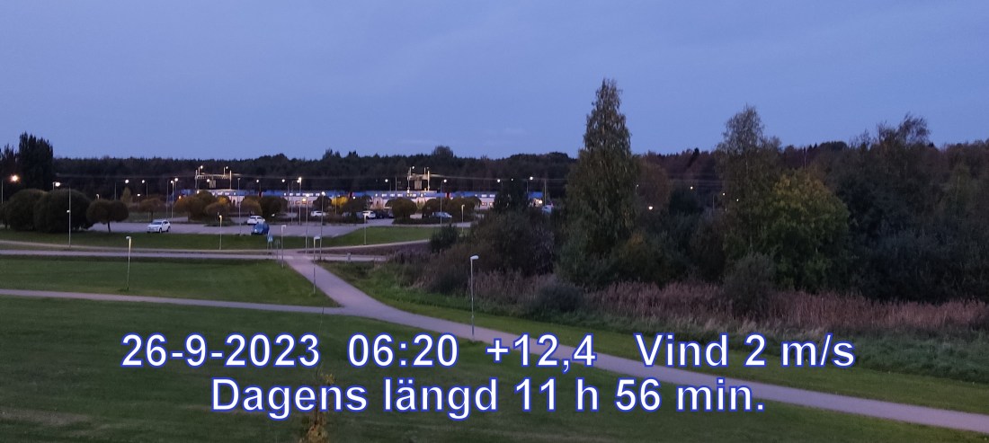 +13° C Vind 2 m/sMolnigt, men troligen uppehåll Känns som+12° Lufttryck 1021 hPa Daggpun+10° Fuktig 87 % Sikt 45310 m Soluppgång 06:42 Solnedgång 18:39 Dagens längd 11 h 56 min.