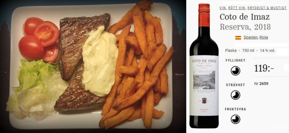 Jag startar med 2 + det får bli Pepparbiffarna små men goda + nr 2 får bli det Spanska vinet..Sedan kommer jag till det som var -..Sötpotatis pommes,inte någon höjdare,inte krispiga utan sladdriga,kan det ha berott på hanteringsfel, kanske!!!..Hur som helst,jag stekte biffarna till medium,lite rosa mitt i..Körde potatisen i airfryern.På tallriken blev det beasås och lite grönt,i glaset rött..
