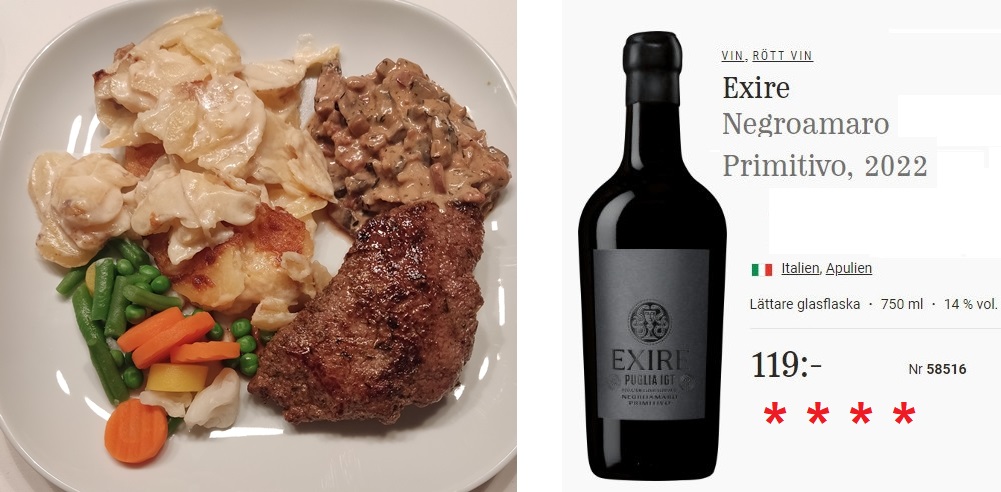 Eller nästan,tror jag hamnade där ett tag.Sonen bjöd i går på Goäta på riktigt. Rostas,potatisgratäng,lite grönt och en förbaskat god röra av bacon, champinjoner,creme fraice och kryddor som jag inte har koll på.Den röda Exire från Italien passade riktigt bra.(läste omdöme,,Medelfyllig och elegant smak med mjuka tanniner och mörk björnbärsfrukt som lyfter vinet. Bra längd och syra i avslutningen gör det till ett fint matvin).