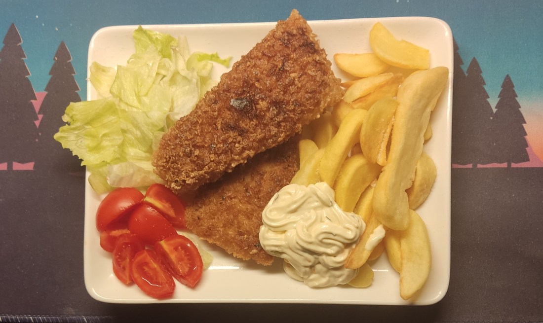 Det som fattades var väl de gröna ärtorna och tidningspappret..Men trots det så smakade det jättegott,sprödbakad Torskfilé,Pommes,remuladsås och lite grönt..Hade kvar en skvätt av den röda Spanjoren Coto de Imaz,så den fick vara med i glaset..Smakade alldeles utmärkt.(Det är lite långt mellan fiskätat).Tror jag ska ta Gubben i örat och be om lite bättring där..