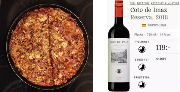 Visst är det lite lyx att få en riktigt god hemlagad pizza,jag ser att toppingen består av tomatsås (hemgjord),riven Prästost, skinka,,fetaost.I glaset min medhavda röda frå Spanien Coto de Imaz,den passade mycket bättre till pizza´n än till pepparsteken jag hade häromdagen..
