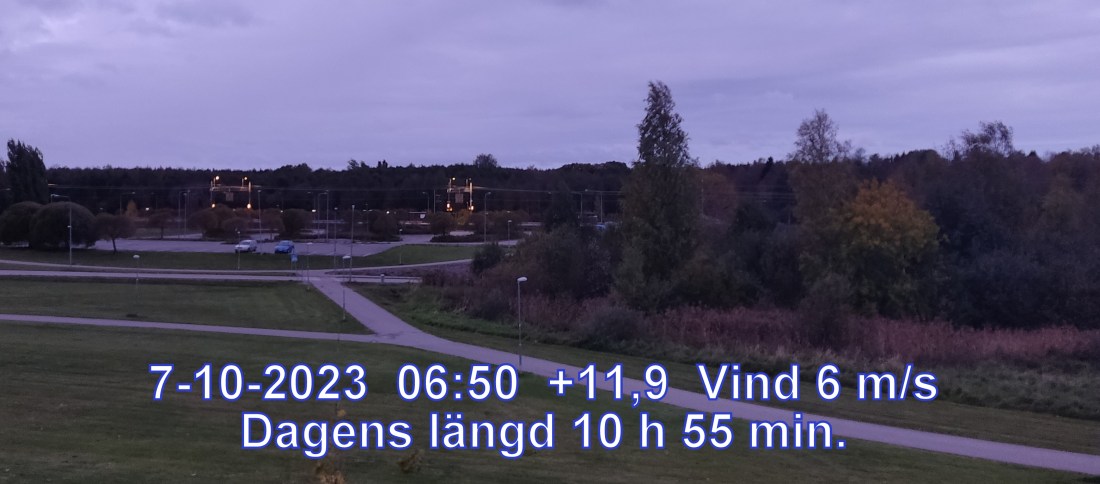 +5° C Vind 6 m/s Mulet, men troligen uppehåll Lufttryck 993 hPa Daggpunkt+1° Fuktighet 78 % Sikt 50000 m Soluppgång 07:09 Solnedgång 18:05 Dagens längd 10 h 55 min.