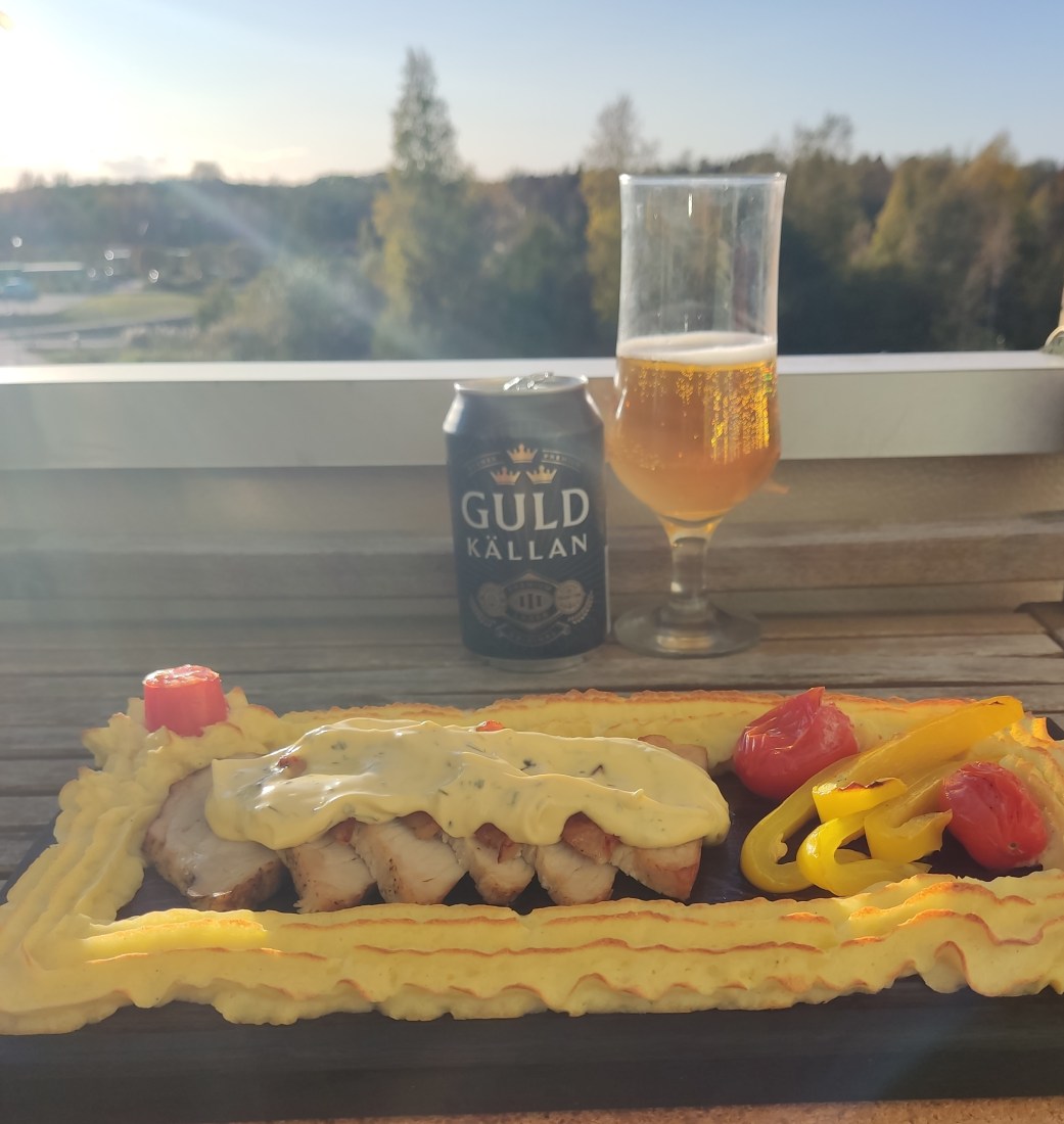 Efter en kulen regnig förmiddag så blev det soligt på eftermiddagen,blåste lite grann,men i min balkongvrå störde inte vinden så värst..Vad bjöd Gubben på…Jo det blev en planka med skivad fläskytterfile,potmos,tomat,paprika och Bea,sås. I glaset blev det en öl idag Guld Källan från Spendrups,funkade riktigt bra.