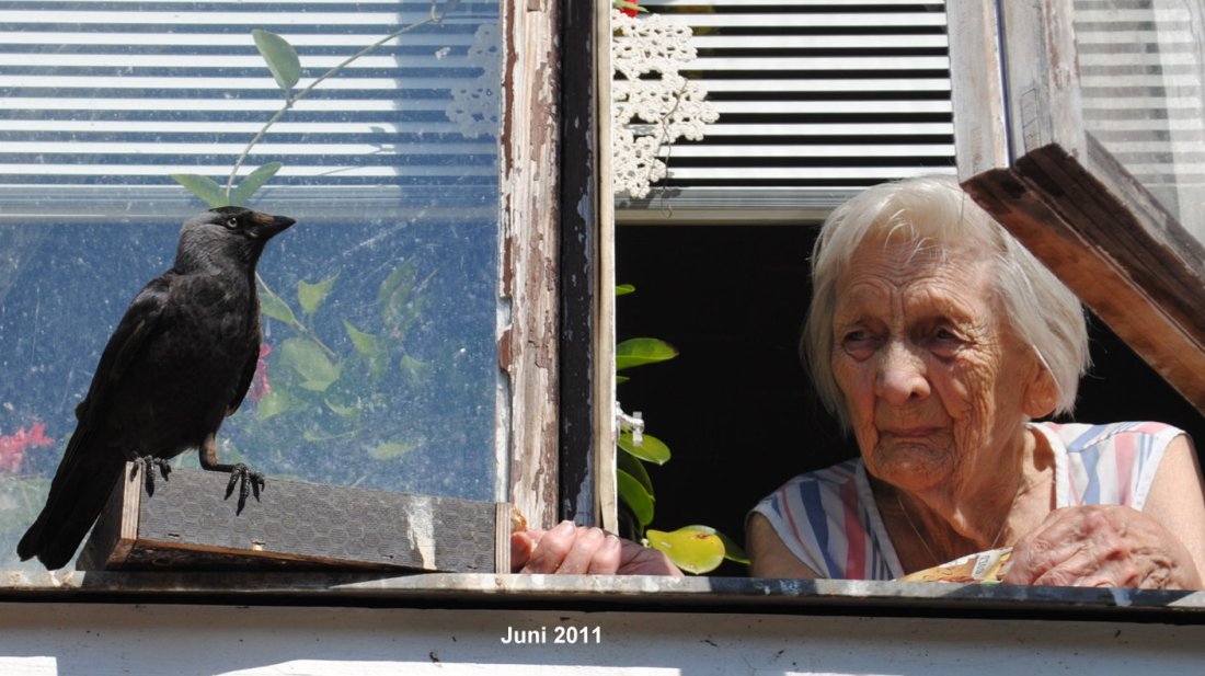 En blogg som Malin Wiper har,där fanns ett inlägg från i söndags med en bild på en Kaja,som satte fart på mitt minne,så jag började söka i mitt fotoarkiv efter en speciell bild,en bild där min mamma pratar med en Kaja,det var så att det var ett par,jag kallade dom Kaj & Kajsa,det paret var stadiga gäster på mammas fönsterkarm,där det alltid fanns något ätbart och dom kom väldigt bra överens mamma och kajorna.Tror dom har en liten pratstund..Bilden är från 2011 då hade mamma nyligen fyllt 91 år..