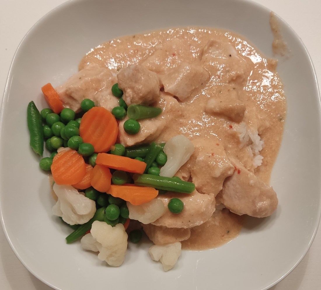 Nä dagens mat,den ska jag döpa till ”Chicken Surprice”.Rätten innehåller förutom ett gäng kryddor,kyckling,ris,bacon och lite grönt..Sonen tyckte inte att det blev som det brukar,,och det kan även jag fatta,,han hade glömt Baconet,tror man kan säga ”Drummel”..Det smakade ganska bra ändå,men hade säkert nått en högre kulinarisk höjd med baconet..Men vinet smakade bra.