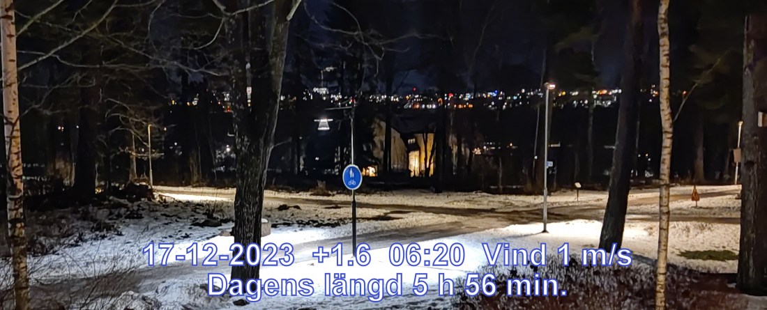 +2° C Vind 1 m/sKlart och uppehållsväder Lufttryck 1013 hPa Daggpunkt+1° Fuktighet 93 % Sikt 9999 m Soluppgång 08:46 Solnedgång 14:43 Dagens längd 5 h 56 min.
