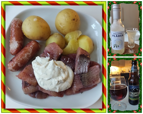 Bättre än så kan jag inte beskriva det som landade på bordet idag…………. Silltallrik med två olika sillsorter,prinskorv,potatis och lite dillsås..Glasen innehöll en riktigt god mörk öl från England och en iskall Hallands Fläder..