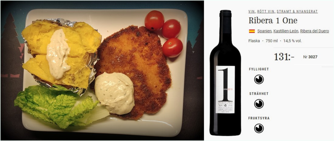 Ja då får både magen och örat njuta,tycker i alla fall jag..Vi börjar med maten, vad hamnade på min tallrik idag,jo det blev en fläsksnitzel,bakad potatis,min egna grek/creme fraice sås och lite grönt,riktigt gott,i glaset den röda spanjoren Ribera 1 One,denna gång en perfekt kombo..