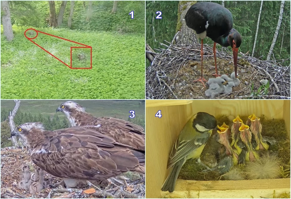 1)..Berguvens unge har nu kommit till rätta en bit ifrån boet..2)..Urga stöter upp lite mat som ungarna glupskt tuggar i sig..3).. Hela familjen Fiskgjuse på plats i boet,Louis har precis kommit med en liten fisk i klorna..¤)..Nu har jag lärt mig att skilja på Talgoxarna,här är det Flori (pappan) som matar sina ungar..