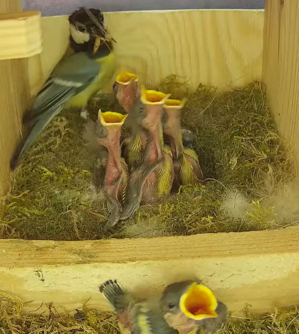 I holken med Talgoxarna hände något oväntat kl 11:21 när en av föräldrarna kom med mat i näbben,så for ungarna upp som raketer,en av dom var nog inte riktigt beredd utan som skjuten ur en katapult så for han ut ur boet och rullade ner en våning.Någon timme senare lyftes locket på holken och ungen fick hjälp tillbaka till sina syskon..