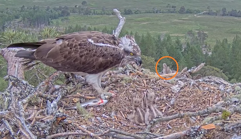 Hickade till för en stund sedan när jag fick syn på en 4:e unge hos Fiskgjusen i Skottland,tänkte först,varifrån kom den..Men det var ett blad av något slag som lurade mig.(Inringat).Så det är fortfarande bara 3 ungar i boet..