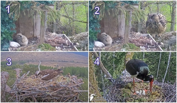 1) Hanna har lämnat boet,kanske för att söka något ätbart..2) Nej hon kom tillbaka tomnäbbad..3) Fiskgjusen Dorcha i Skottland och 4)Storken Urga i Lettland ser till att rulla runt äggen men jämna mellanrum..
