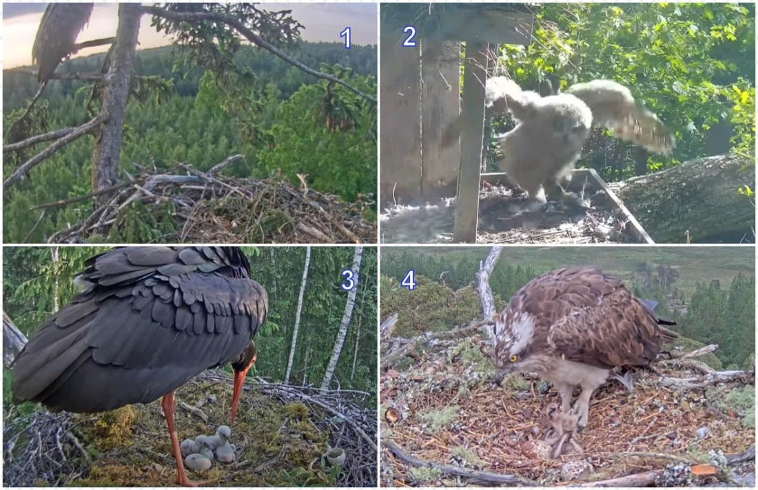 1).Nu kan man not utesluta att det ska ske något i Havsörnboet,tidigt i morse så satt Milda på en gren på sidan om boet..2).Berguvens unge provar sina vingar, men än dröjer det många veckor innan dom bär,mamma Hanna är nu borta allt längre stunder från boet..3).Den Svarta Storken Urga pysslar om sina ägg och ungar,fortfarande 2 ägg kvar som ska kläckas..4).Det är fortfarande 1 ägg kvar som ska kläckas hos Fiskgjusen Dorcha…Bilderna är från tidigt i morse.Kollade nyss,ingen förändring har skett sedan dess..