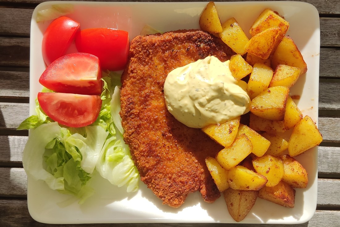 Eftersom vädergubben var på ett strålande humör idag,så skulle väl inte jag vara sämre,så jag intog balkongen spände upp mitt lilla parasoll och njöt..Blev en tallrik med lite goäta också en liten snitzel stekt potatis bea o lite grönt..
