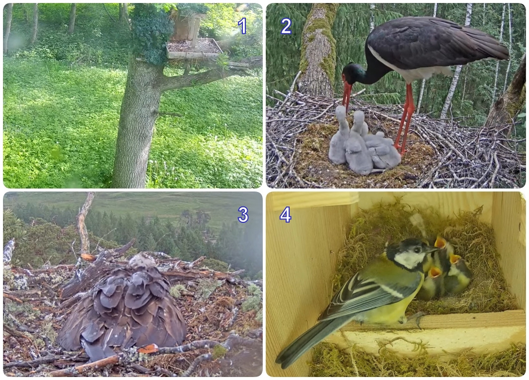 1)..Hos Berguven har inget nytt kommit fram,senaste skymt av ungen var 29/5.. 2)..Urga pysslar om sina 4 små,som växer så det knakar..3)..Mamma Dorcha brer ut sig över sina 3 små ungar,där råder just nu ett riktigt busväder blåst och regn..4)..Här har jag nu fått förklarat vad som hänt,igår 3/6 så dog en av ungarna,filmaren lyfte bort den ungen genast..Båda föräldrarna Flora och Flori jobbar hårt för at de 5 små ska vara mätta.(Mamma Flora på bilden)